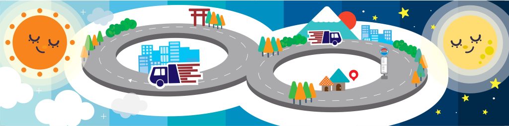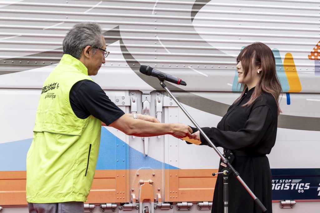 最優秀賞となった 永山茉桜(ながやま まお)さんの作品は、静岡県トラック協会会員事業者(㈱エムツー静岡)が所有する緑ナンバー大型トラックへラッピングし、イベント当日にお披露目をいたしました。本車両は輸送車両として利用され県内外を運行いたします。